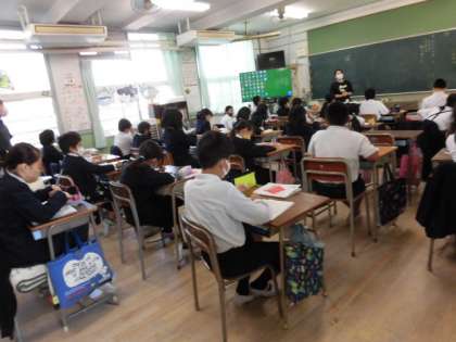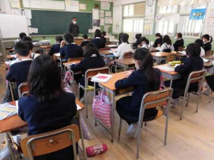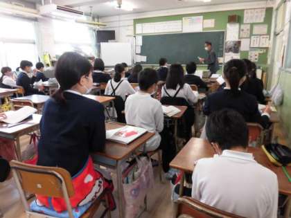 1組も2組も国語です。1組は「ごんぎつね」の第3段落について考えています。2組は「だから」など、接続詞について学習しています。