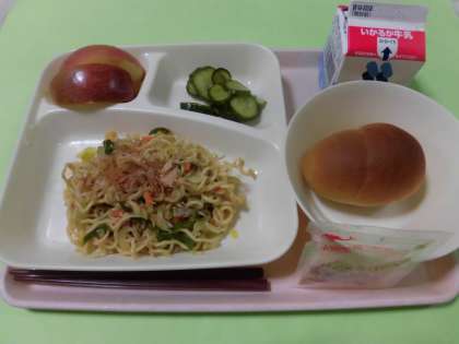 ・和風焼きそば(かつおぶし付き)・きゅうりのしょうがづけ・りんご・黒糖ロール(小)・牛乳 です。