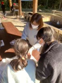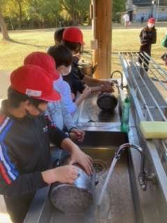 鍋を洗うのがとっても大変。でも、次に来る学校のために心を込めて磨きます!