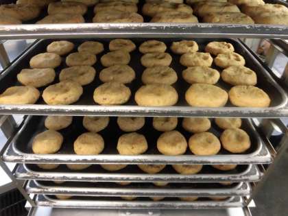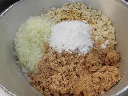 豆腐を細かく切って、ツナ、みじん切りにした玉ねぎ、でんぷん、砂糖、塩、こいくちしょうゆを混ぜてよく練り、一つひとつ丁寧に丸めて焼いています。
