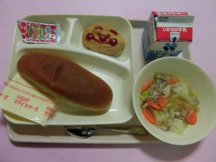 ・豆腐ハンバーグ・カリフラワーのスープ煮・スライスチーズ・黒糖パン・牛乳です。