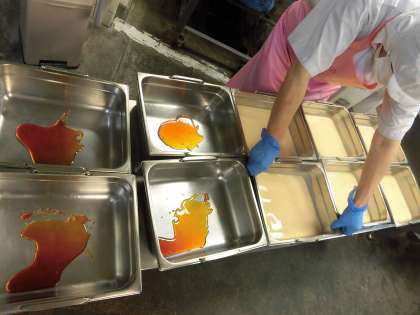 今日の焼きプリンは、卵、牛乳、生クリーム、砂糖を合わせたものを、手作りのカラメルソースを入れたミニバットに流し入れ、焼き物機で25分間蒸し焼きにします。