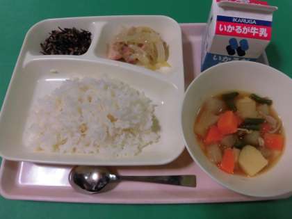 ・鶏肉のゆず塩焼き・含め煮・魚ひじきそぼろ・ご飯・牛乳 です。