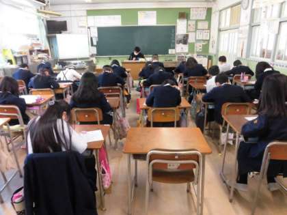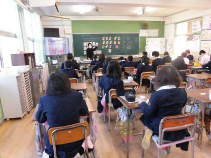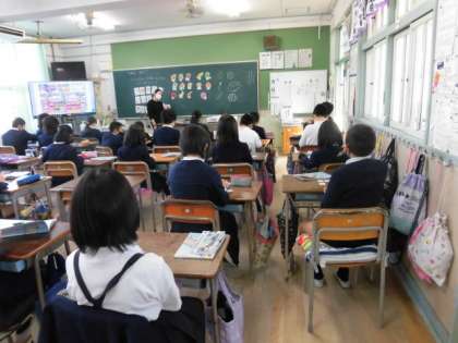 1組は社会で、都道府県テストをしています。2組は英語です。いろいろな野菜や果物を英語でどのように言うかを学習しています。