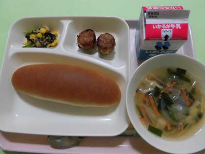 ・揚げシューマイ・とうふのスープ・ツナとチンゲンサイのいためもの・黒糖パン・牛乳です。