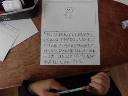 昨日行ってきた「まちたんけん」で聞いたことや思ったことなどを絵をつけて、書いています。ご協力いただいた、地域の人にも感謝ですね。