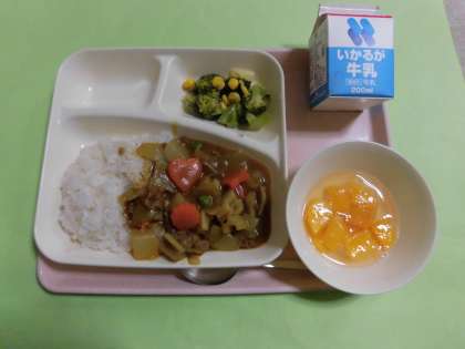 ・冬野菜のカレーライス・ブロッコリーとコーンのサラダ・黄桃(カット)・牛乳 です。