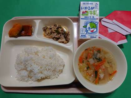 豚肉と干しずいきのみそ煮、うすくず汁、焼きかぼちゃの甘みつかけ、ご飯、牛乳です。