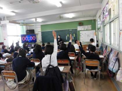 1組は転校する友だちへのお手紙を書いています。2組は「も」や「だが」という接続詞を使ったオリジナルの文を考えています。