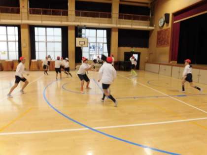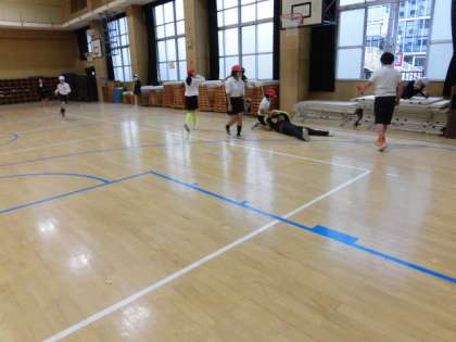 体育館で鬼ごっこをしています。先生もたおれこむくらい一緒に参加して、楽しんでいました!