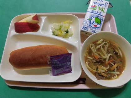 カレーうどん、はくさいの甘酢あえ、りんご、コッペパン、ブルーべリージャム、牛乳です。
