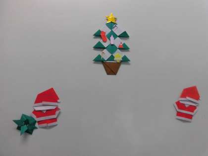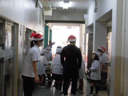 今日は、調理員さん手作りの飾りつけの中、普段の帽子の上にサンタさんやトナカイさんをのせて、早めのクリスマス気分を味合わせていただきました。