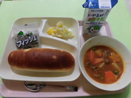 ・ビーフシチュー・カリフラワーのピクルス・ミニフィッシュ・おさつパン・牛乳です。