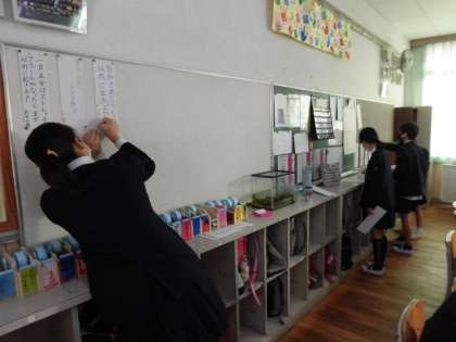 1組は算数でクラスごとの長縄の回数の比べ方の方法について考えています。2組は今年の目標を貼りだしたり、卒業文集の清書をしたりしています。