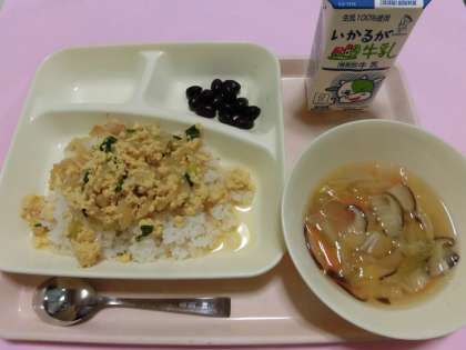・親子丼・澄まし汁・黒豆の煮物・牛乳です。