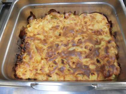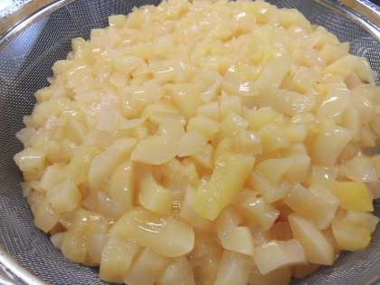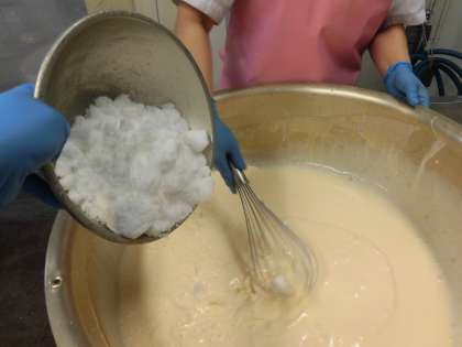 桃のクラフティに使う白桃は、山形県産のものです。卵、生クリーム、ふるった小麦粉、砂糖、白桃を混ぜ合わせたものを、コーンフレークを敷いたミニバットに流し入れて焼きます。
