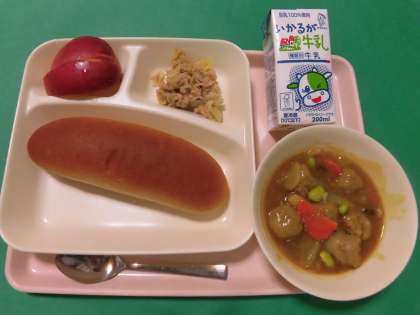 ・ミートボールと野菜のカレー煮・ツナとキャベツのソテー・りんご・黒糖パン・牛乳です。