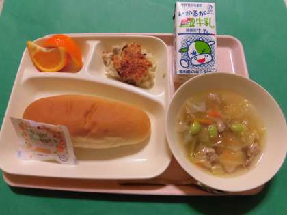 ・押し麦のグラタン・スープ・いよかん・コッペパン・アプリコットジャム・牛乳です。