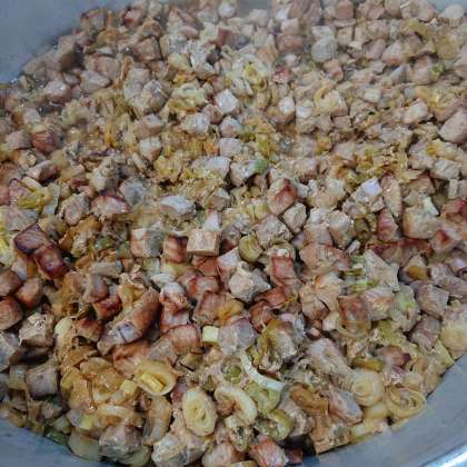 皆さんが、好きな魚の一つまぐろを白ねぎと一緒に、甘辛く焼いています。