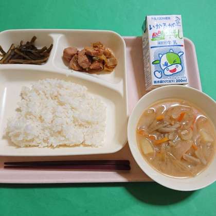 まぐろの甘辛焼き、豚汁、茎ワカメのつくだ煮、ご飯、牛乳です。