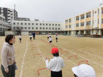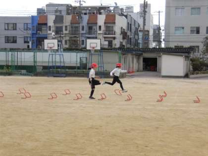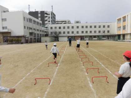 今日はハードルの練習をしています。ちょうど雪が降ってきて、「寒い寒い」と言いながらも、元気に活動していました。