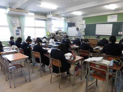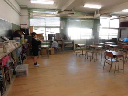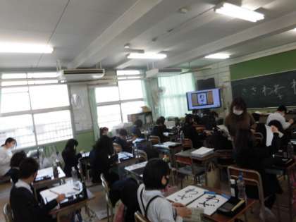 1組は音楽の授業です。一人ずつ学習室で、リコーダーのテストをします。「緊張するなア」。2組は書写で、「わざ」という字を書いています。ひらがなが意外と難しい!