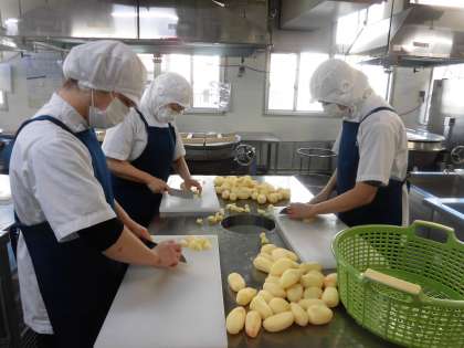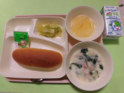 今日のクリームシチューは、ほうれん草、エリンギ、じゃがいも、にんじんがたっぷり。とても彩のよいシチューです。生クリームも入れるので、こくがあっておいしいですよ!