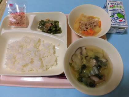 ・変わり肉じゃが・鶏肉と白菜のすまし汁・さんどまめのごまあえ・ご飯・牛乳です。