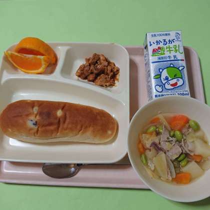 鶏肉のみそバターソース、洋風煮、デコポン、おさつパン、牛乳です。