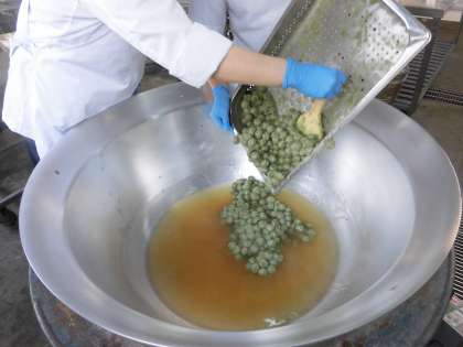 今日のデザートは、きなこよもぎだんごです。よもぎは、春に生えてくる野草ですが、とても香りがよいのが特徴です。きなこをかけていただきましょう。きなこは、炒った大豆を粉にしたもので、体をつくる赤の働きをする食べ物です。