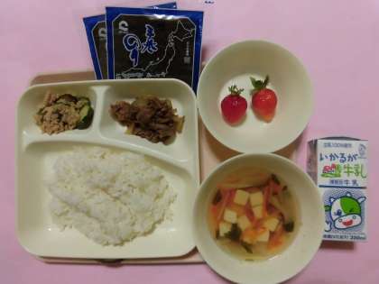 ・手巻きご飯(牛肉の甘辛煮・ツナソテー)・すまし汁・いちご・牛乳です。