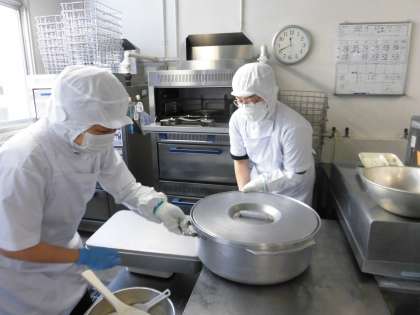 3枚目の写真は、炊き立てご飯が入っている大きな釜です。北巽小学校では、ご飯を給食室で炊いています。大きな釜を6つ使って炊き立てのご飯を出しています。