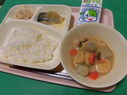 ・さごしのおろしじょうゆかけ・一口がんもとさといものみそ煮・もやしのゆずの香あえ・ご飯・牛乳です。