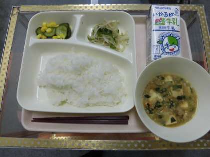 ・ごはん ・牛乳 ・マーボーどうふ ・きゅうりとコーンの甘酢あえ ・もやしとピーマンのごまいため です。