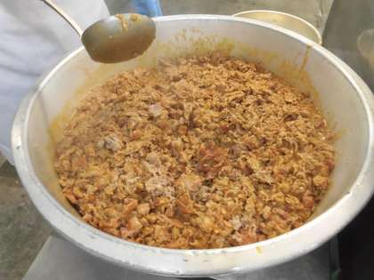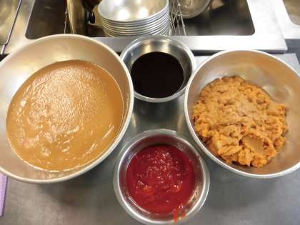 今日は、焼き物機で焼いた豚肉に、りんごピューレ・デミグラスソース・ウスターソース・ケチャップで作ったソースをかけています。