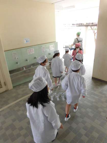 給食が始まって1週間が経ちました。1年生も、できるところはみんなで力を合わせて給食の準備をしています。