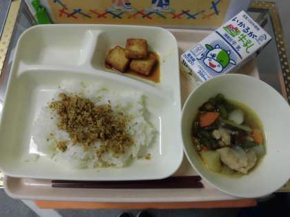 ・ごはん ・牛乳 ・鶏肉とじゃがいもの煮もの ・あつあげのしょうゆだれかけ ・紅ざけそぼろ です。
