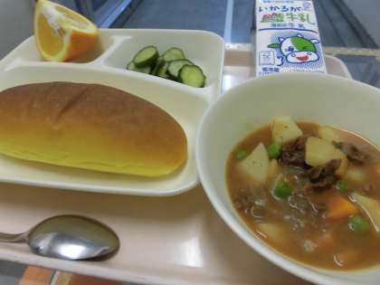 ・パンプキンパン ・牛乳 ・ビーフシチュー ・きゅうりのサラダ ・あまなつかん です。