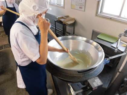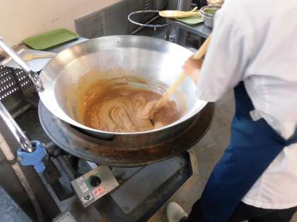 ビーフシチューのブラウンルウは、給食室で小麦粉と綿実油をじっくり炒めて作っています。
