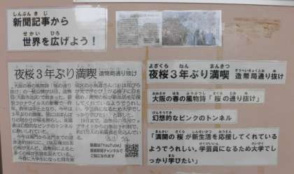 児童朝会では、「夜桜3年ぶりに満喫 造幣局桜通り抜け」の新聞記事を紹介しました。