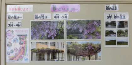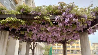 3月に満開だった桜の花も、4月の入学式後は、散ってしまい、葉桜となりました。しかし、今校庭では、藤の花が満開です。