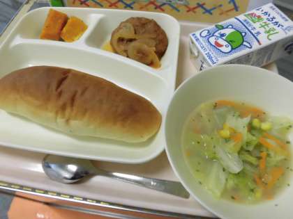 ・レーズンパン ・牛乳 ・煮こみハンバーグ ・コーンとキャベツのスープ ・焼きかぼちゃ です。