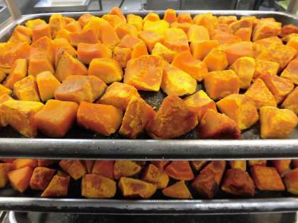 焼きかぼちゃは、塩をかけて焼き物機で焼いています。