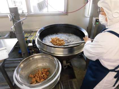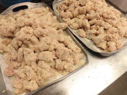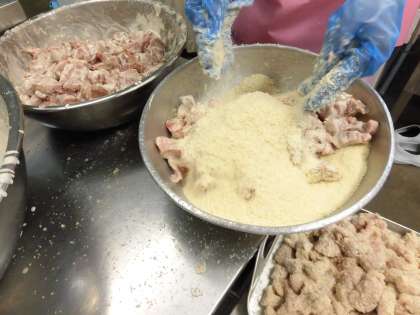 今日は、豚肉に小麦粉とパン粉で衣をつけて揚げた「一口トンカツ」です。給食では、衣に卵を使っていないので、卵アレルギーのある人も食べることができます。豚肉には、ワイン、塩、オールスパイスで下味をつけています。