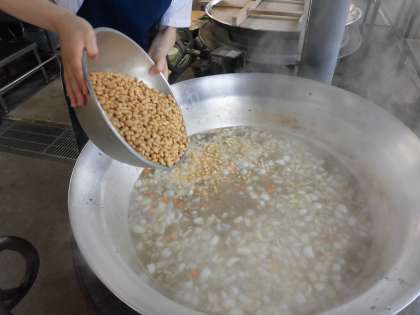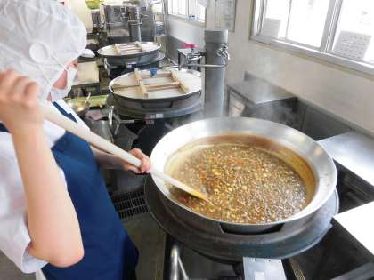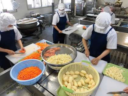 「畑の肉」とよばれる大豆も入っているので、体をつくるたんぱく質がたっぷりです。今日も調理員さんからのプレゼント「ラッキーにんじん」がたくさん入っています。