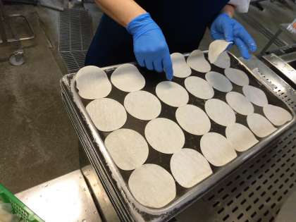 今日の「変わりピザ」は、ぎょうざの皮に、具をのせて焼き物機で焼いています。