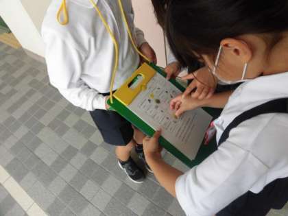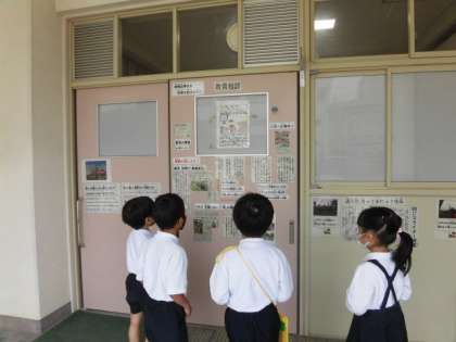 「がっこうたんけん」では、2年生が、各部屋について事前に調べたことを1年生に説明します。わかりやすく、ゆっくりと大きな声で教えていました。それぞれの部屋を探検できたら、カードにシールを貼ります。時間内に回れるように、グループで協力していました。