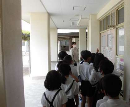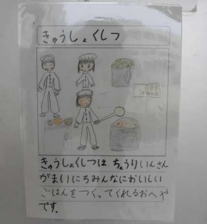 2年生は、4月下旬ごろから、1年生との「がっこうたんけん」に向けて構内を回り各部屋について調べました。調べたことを、1年生に紹介できるように、絵や文章で1枚の用紙に表現しました。例の給食室についての図にあるように、各部屋についてわかりやすくまとめていました。この図は、1年間ずっと、各部屋の扉に貼られます。