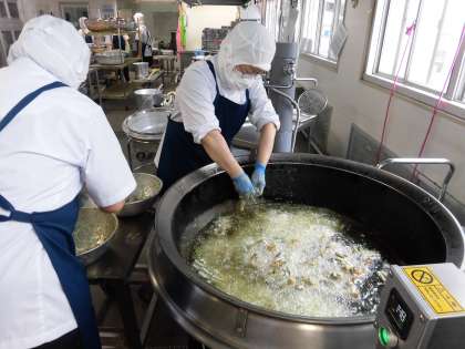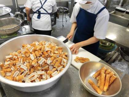 ちくわに小麦粉と青のりで作った衣をつけて、油で揚げています。衣がはがれてしまわないように、ていねいに作ってくださいました。青のりの香りがとても良く、もっと食べたくなりますね。
