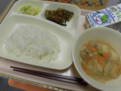 ・ごはん ・牛乳 ・ちくわのいそべあげ ・あつあげとさといものみそ煮 ・あっさりキャベツ です。